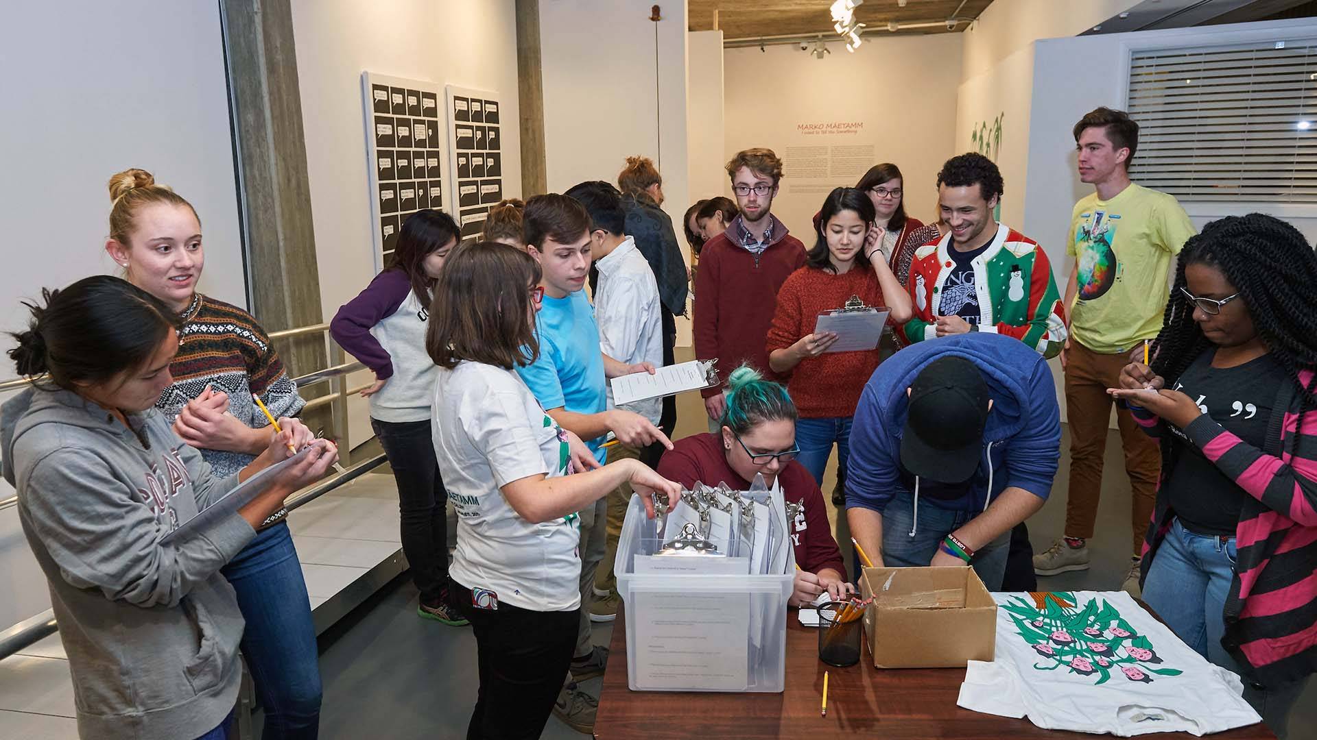 Students and parents participate in a scavenger hunt based on Marko Mäetamm’s exhibition I Want to Tell You Something at the Picker Art Gallery.
