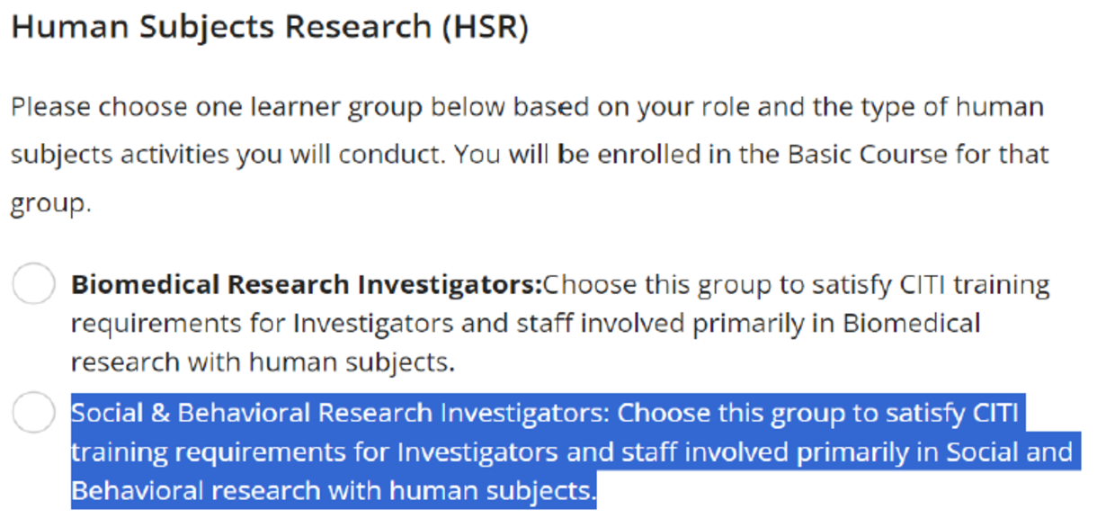 For any faculty or students new to research with human participants, please note that Colgate University has a Collaborative Institutional Training Initiative (CITI) subscription that includes access to a basic training for research involving human participants. To access this training, log in here through your organization (choose Colgate University to access through our SSO). There are many trainings available, which can be viewed by clicking “add a course.” One training that might be particularly helpful is the course targeted to “Social & Behavioral Research Investigators” as highlighted in the screenshot.