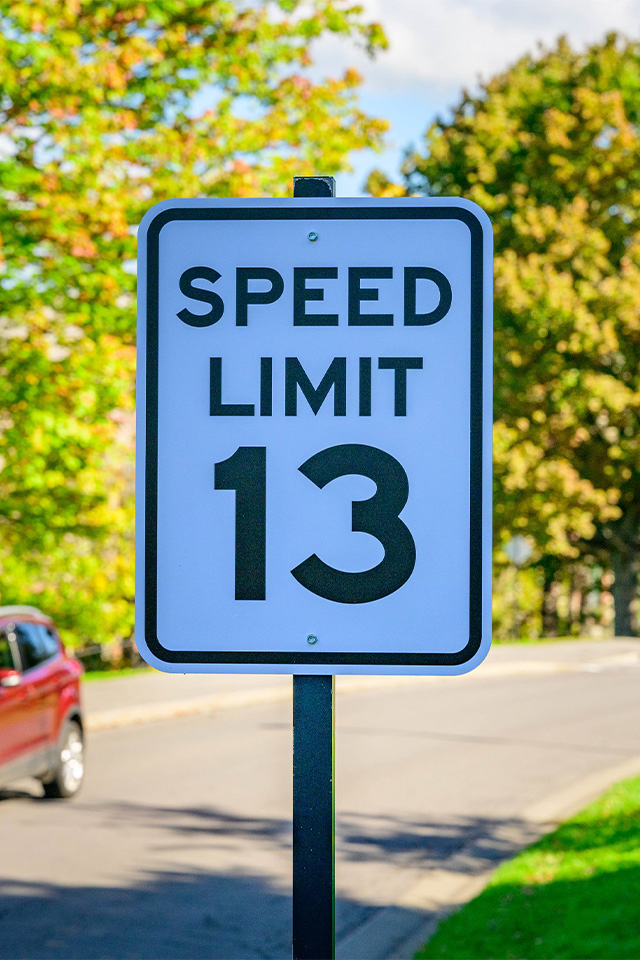 Speed limit signs around Upper Campus reflect the importance of the number 13 to the Colgate community.