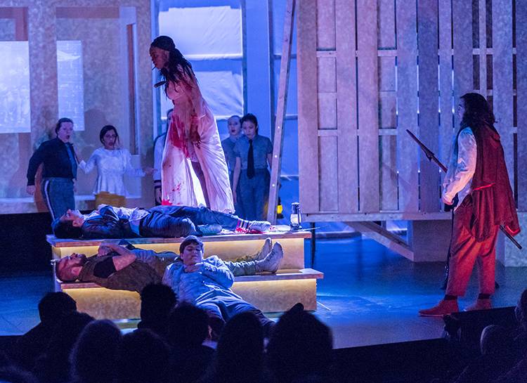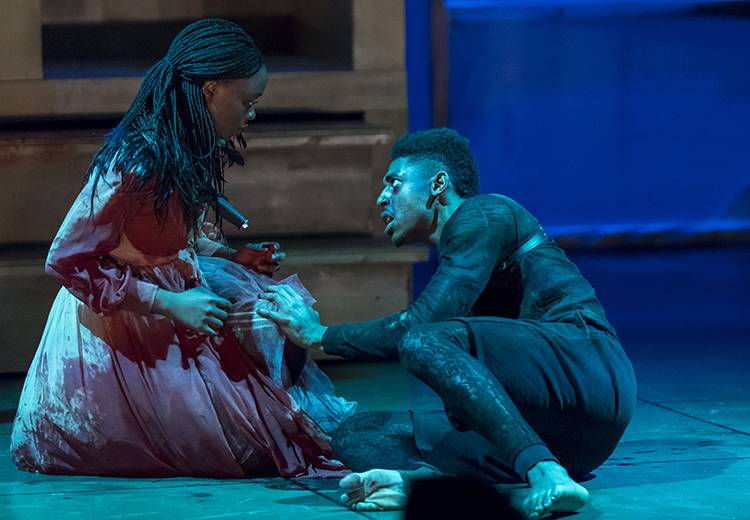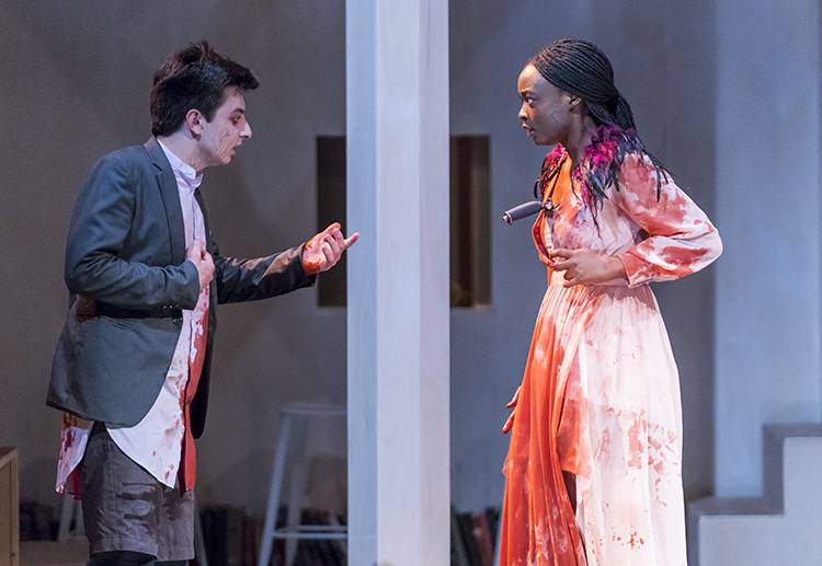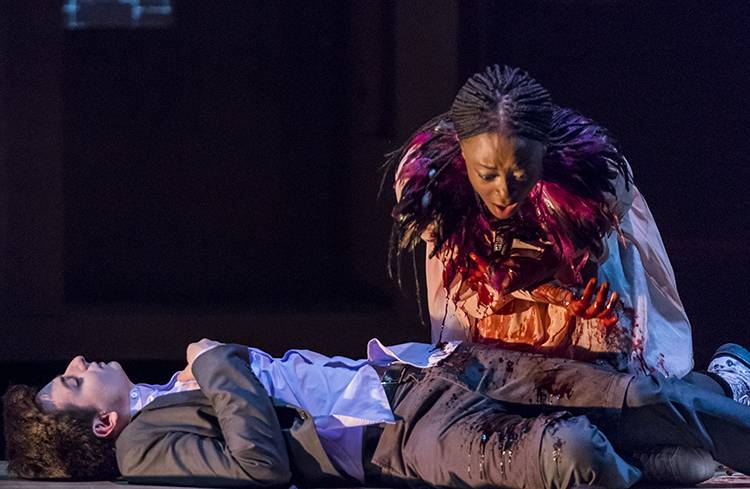 “I dreamt my lady came and found me dead.” It is not the obsession with the dead and thus (un)dead that Melody Bates asks of us in her comedy R & J& Z, but I find it is the obsession with the dream, the moment of transition between two worlds. This new play before us erupts out of Shakespeare’s tumultuous, violent love story and brings forth a world with the logic and physics of the dream. A dream where the familiar blows into the absurd and the nightmare, for all too understood reasons, is reality. What choices are we bound to make? Are we bound by our choices? What holds us in place? Can we escape our bonds? Are we bound to have them follow and consume our world and one another? Might we prove a path that breaks from form to reveal a light, a great lantern, a shiny place of our own making with harmony and beauty? Using Shakespeare’s Romeo and Juliet as a springboard Bates tackles the high and low, brings our collective drive for shock and feeling much closer for us to see because these days what is on our screens in front of us is all we know.