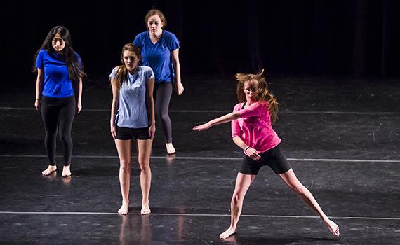 In the last movement of her dance performance titled Wires, April Bailey ’14 (pictured in pink) breaks free from the group and moves independently — just as she’s demonstrated academically.