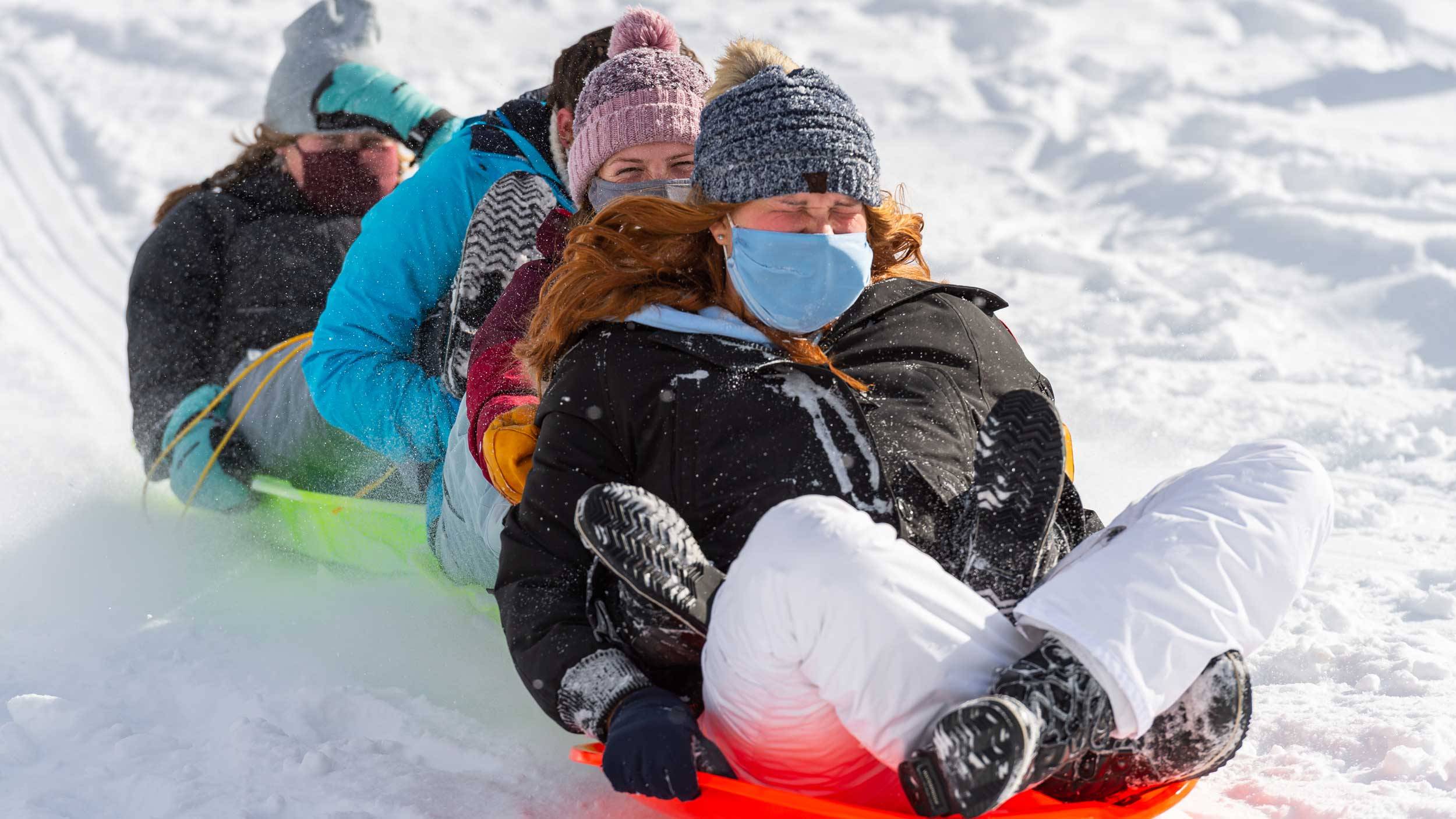 At the beginning of the spring 2021 semester, Colgate students were required to quarantine upon returning to campus. The quarantine presented me the opportunity to photograph students participating in many outdoor activities at that time, including this image of students sledding down the hill between College Street and James B. Colgate Hall one sunny afternoon.