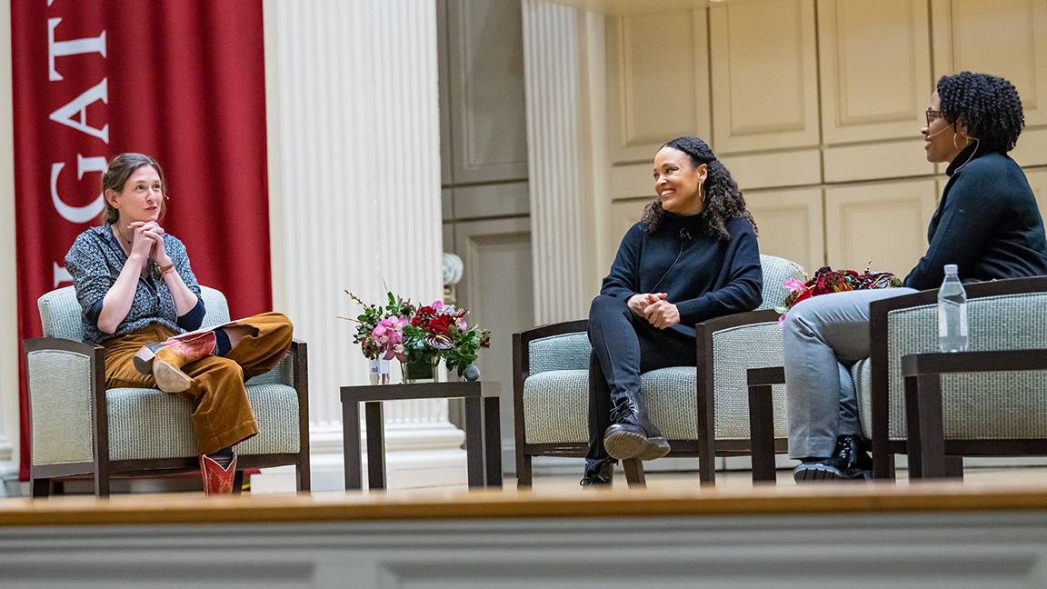 Author Jesmyn Ward appeared in the chapel on Friday evening as a special guest in Colgate’s Living Writers series. The first woman and person of color to win the National Book Award for fiction twice, Ward answered questions from Colgate students and talked about the nuances of her work, her creative and writing processes, and her sources of inspiration. Ward also shared her desire to amplify the voices and stories of those who have been marginalized or had their histories erased, and the important role stories have in linking our past to our present.