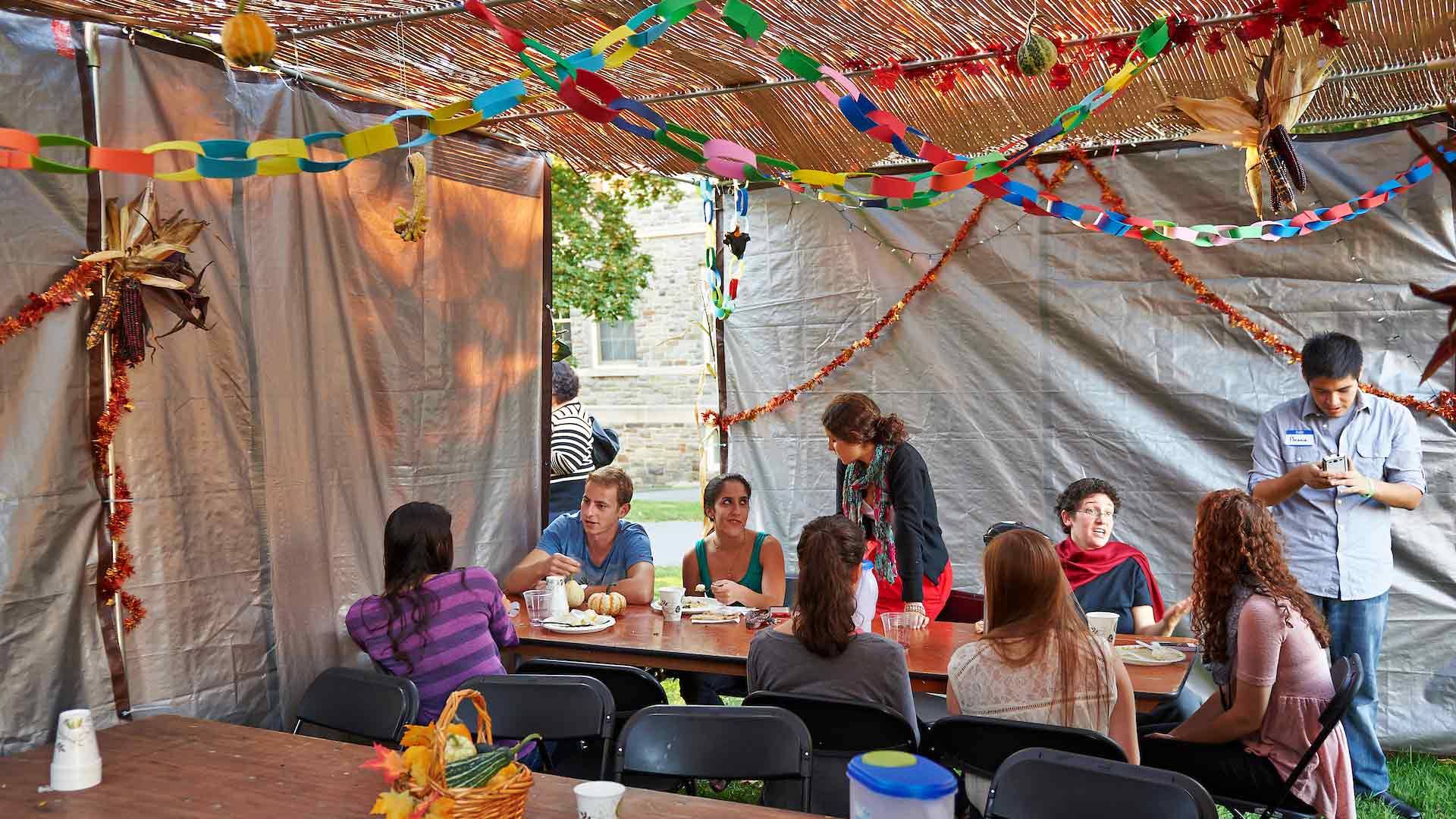Students celebrate Sukkot, the Jewish harvest festival, in a sukkah, which is a temporary structure built on the academic quad.